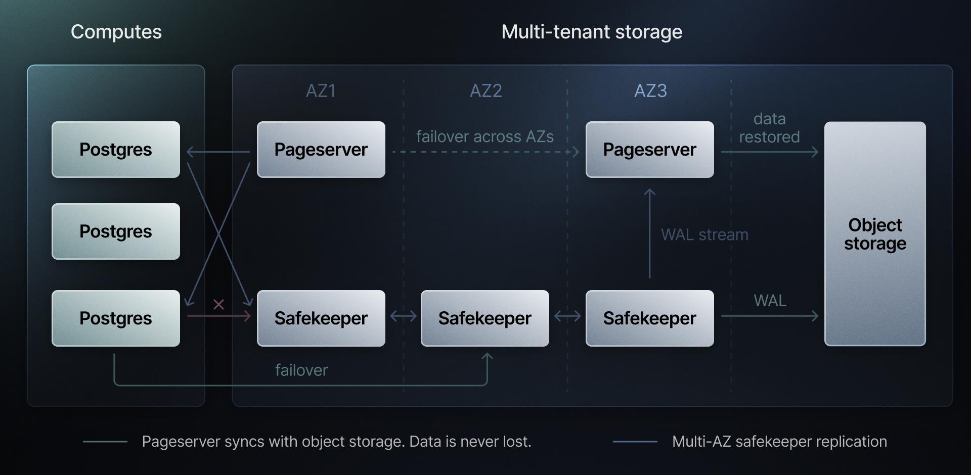 Multi-AZ by design. Neon replicates your data at the storage layer across multiple AZs, removing the need for full-size standby instances.